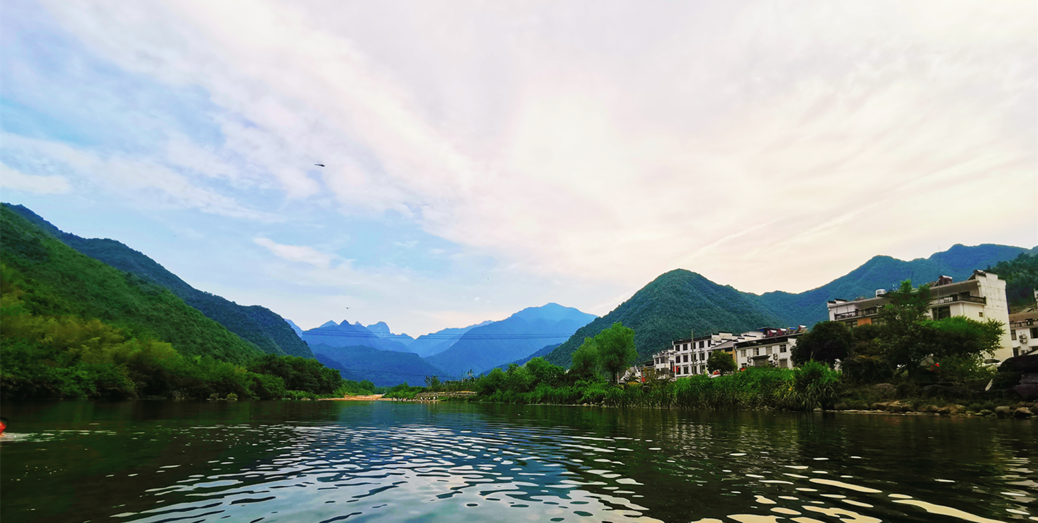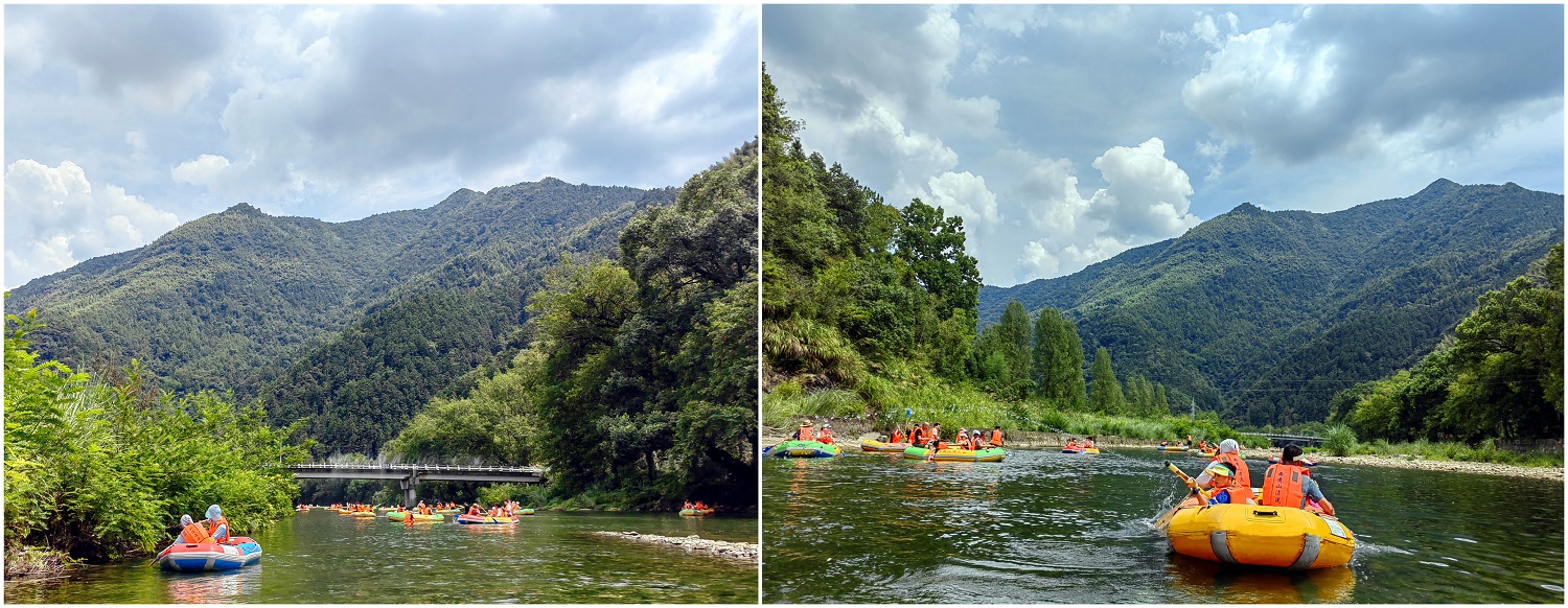 此次行程兩天一夜,在導游的帶領之下,我們首先來到石臺縣大演鄉(xiāng)剡溪村的西黃山漂流景區(qū)。下榻之時,正值正午時分,景點兩岸青山疊嶂、風光旖旎、草木蔥蘢、景色怡人。協(xié)普家人們換好服裝,穿上救生衣,在工作人員的協(xié)助之下,或一家?guī)卓?、或三五好友結伴乘筏而行、泛舟漂流,水面波光瀲滟、河底各式各樣的鵝卵石靜靜地躺著,日復一日被溪水沖刷,變得光滑又圓潤,坐在游筏里俯身去看,“瞧,有不少小魚正悠閑地在它的身上游過呢”,其水之清澈由此可見一斑。此次漂流全程3公里,在漂流過程中,除了欣賞到秀美的湖光山色,體驗到劈波斬浪的沖刺暢快感,更讓人愜意的是,在河灘淺水區(qū)域漂流回緩,協(xié)普家人們正帶著孩子們,在這悠閑的時光里愉快的打起了水仗,孩子們帶上了自己心愛的水槍玩起了水槍大戰(zhàn),有人帶來了水盆和水瓢,于是乎水槍大戰(zhàn)現(xiàn)場演變成了潑水節(jié),歡笑聲、尖叫聲蕩漾在山谷之間,在這愜意的時光里,平日的壓力和煩擾仿佛已煙消云散。