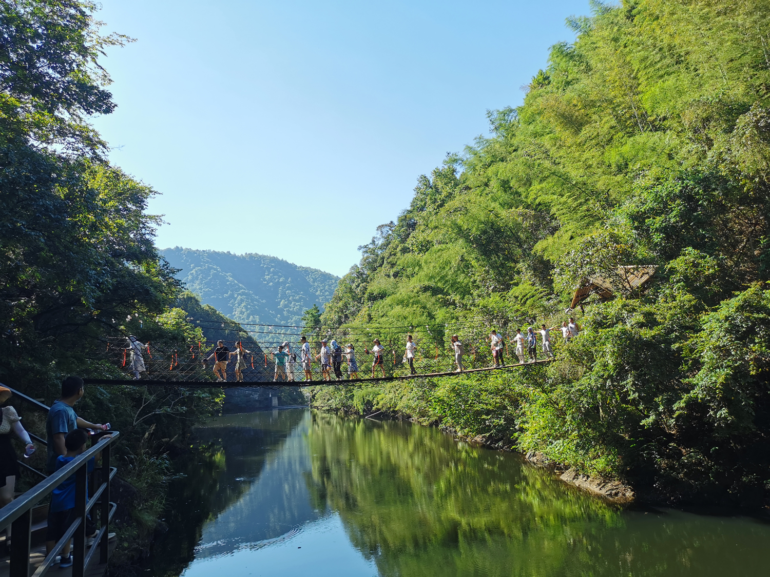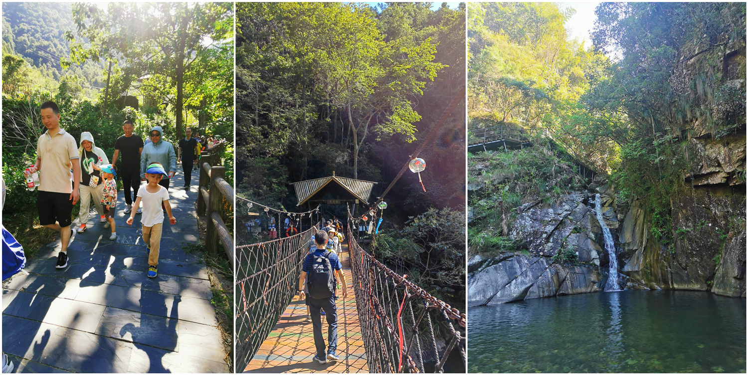 晚上體驗了農家樂菜肴和當?shù)靥厣袼藓?,第二天早早的起床,吃完早餐集合,大家興致勃勃地乘著大巴來到了醉山野景區(qū),這里是安徽省內第一個5D玻璃橋皖南地區(qū)最大的瀑布群。在進入景區(qū)之前,有一段鄉(xiāng)村道路,徒步的過程頂著早上八九點的太陽就覺得酷暑難耐,然而當我們正式踏入景點,走在山谷間的步棧道上,遠處是蔥郁的山林、近處是流動的溪水、頂上是一片陰涼,只聽見大朋友們小朋友們都在說“好涼快啊,好涼快啊!”沿著步棧道繼續(xù)前行,來到了千花橋,這里是著名的網紅打卡點,小朋友們都絡繹不絕的脫下鞋子、挽起褲腳,下水嬉戲游玩。有合影拍照的、有撿起小石片仍水花的、還有在石頭縫里抓螃蟹的。大家坐在陰涼的石頭塊上休憩閑聊,甚至玩笑起來,富硒山水、天然氧吧,以后老了退隱山林一定要來這里休養(yǎng)生息。有人不被沿途風景耽誤過久,繼續(xù)往山上攀爬,他們到了山頂穿過了玻璃棧橋,體驗了“一覽眾山小”的視野和格局。由于兩個月沒有下雨,雖有山谷溪流卻看不到震撼的黃崖瀑布群,實屬遺憾,卻也給大家下次再來此一游留下了機會。