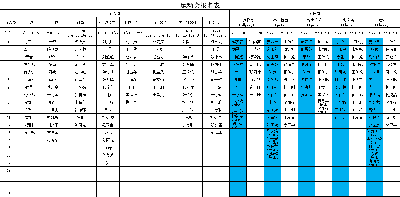 金秋送爽、丹桂飄香,在這秋高氣爽的美好時節(jié),我們滿懷喜悅的心情迎來了公司2022年度秋季職工運(yùn)動會。本屆運(yùn)動會分個人賽、團(tuán)體賽,自10月20日至22日共持續(xù)3個下午,比賽項(xiàng)目包括乒乓球、羽毛器(男子、女子單項(xiàng))、臺球、跳繩、仰臥起坐、女子900米,男子1500米長跑8項(xiàng)個人賽,還有齊心協(xié)力、運(yùn)球接力、女子接力賽、男子接力賽、撕名牌、拔河共6項(xiàng)團(tuán)體賽。在歷屆運(yùn)動會的賽程、賽項(xiàng)上都增加了新的活動亮點(diǎn),從參賽名單上不難看出,全體協(xié)普家人的熱情和參與度都異常高漲。